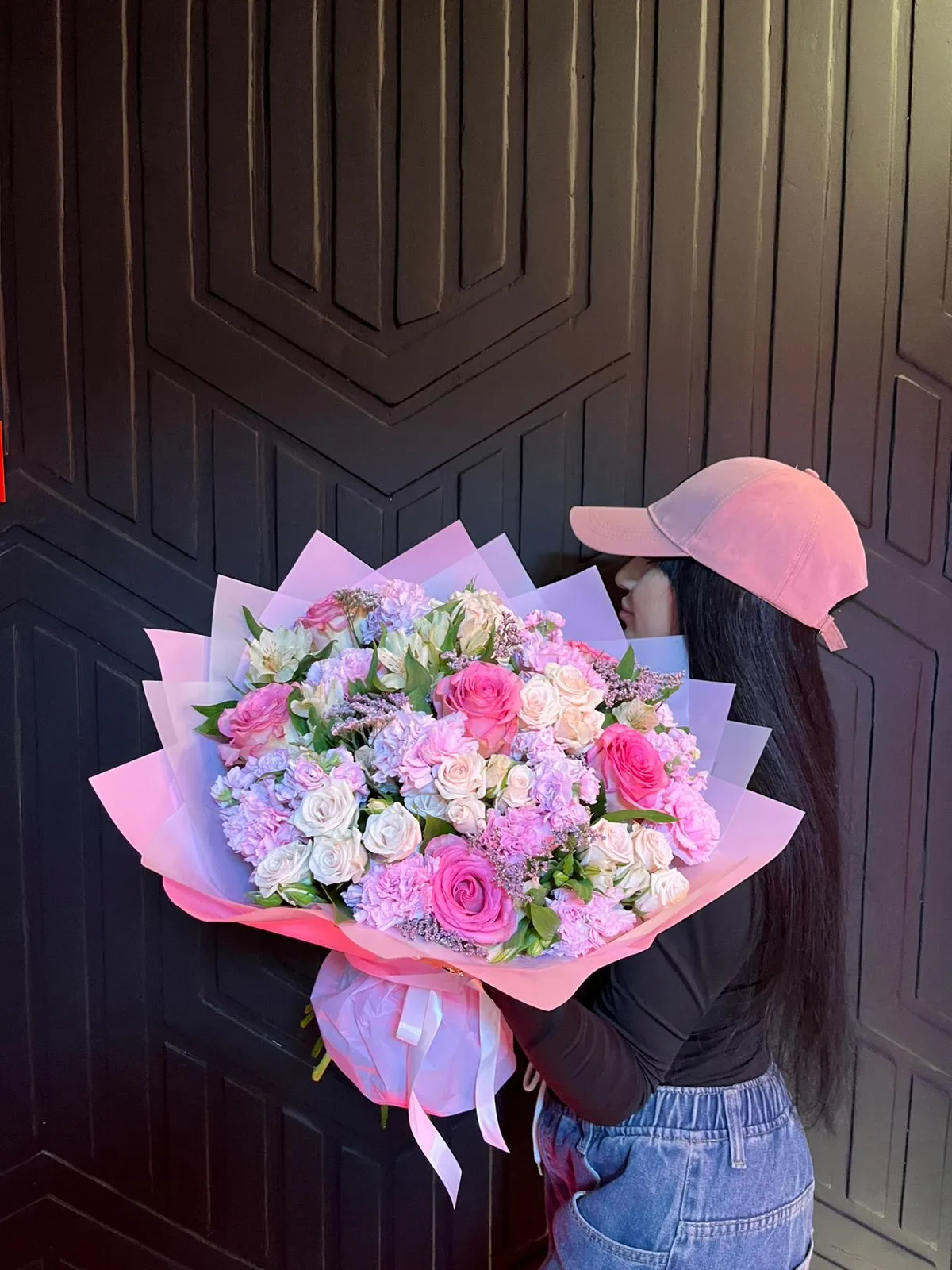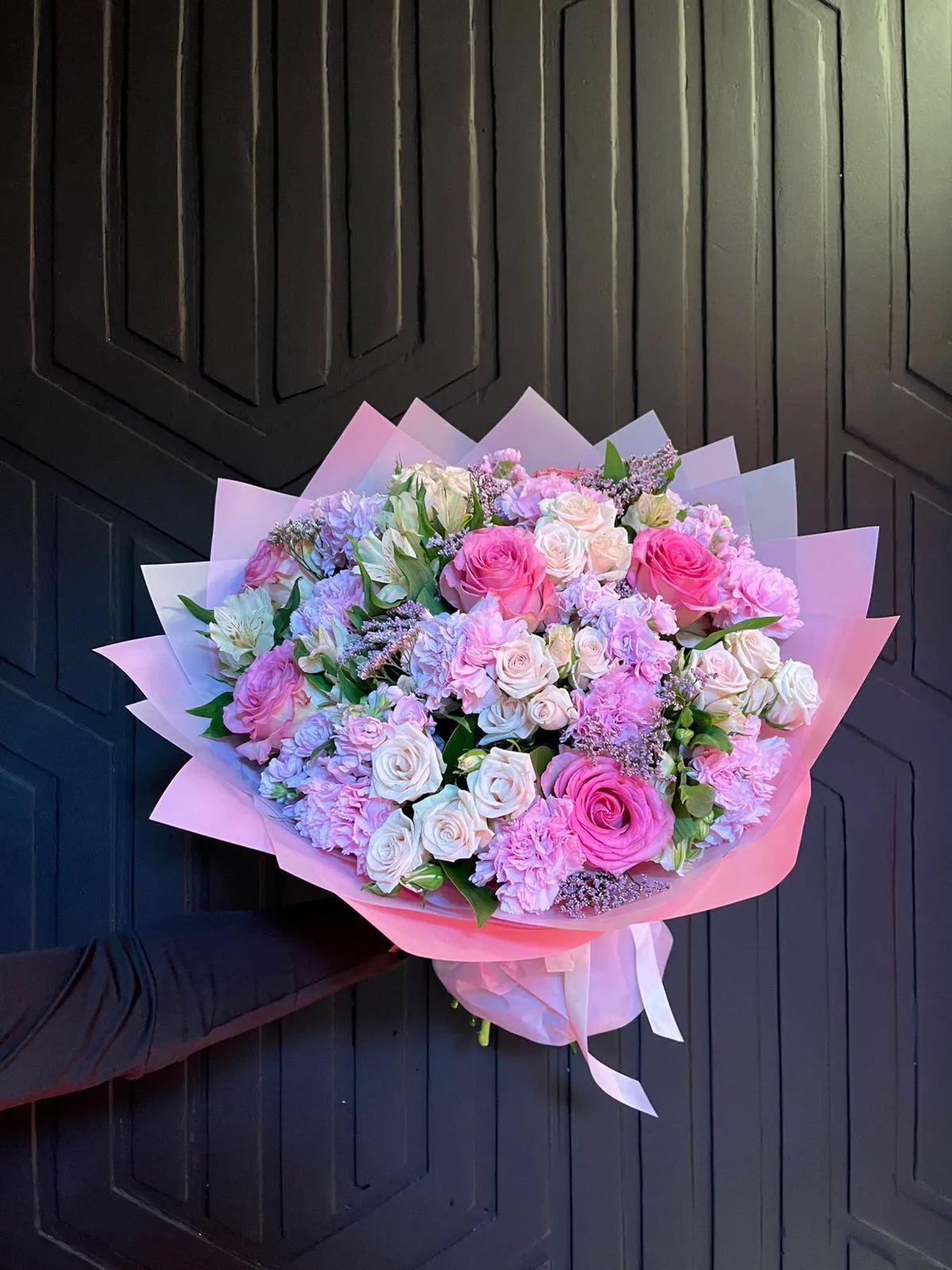 Авторский Букет (Сладкая вата) – идеальный выбор для создания атмосферы любви и заботы. - Уникальный состав – сочетание кустовых роз, альстромерий, маттиолы и гвоздик в мягких кремовых, лиловых и розовых оттенках создаёт гармоничный и запоминающийся образ.