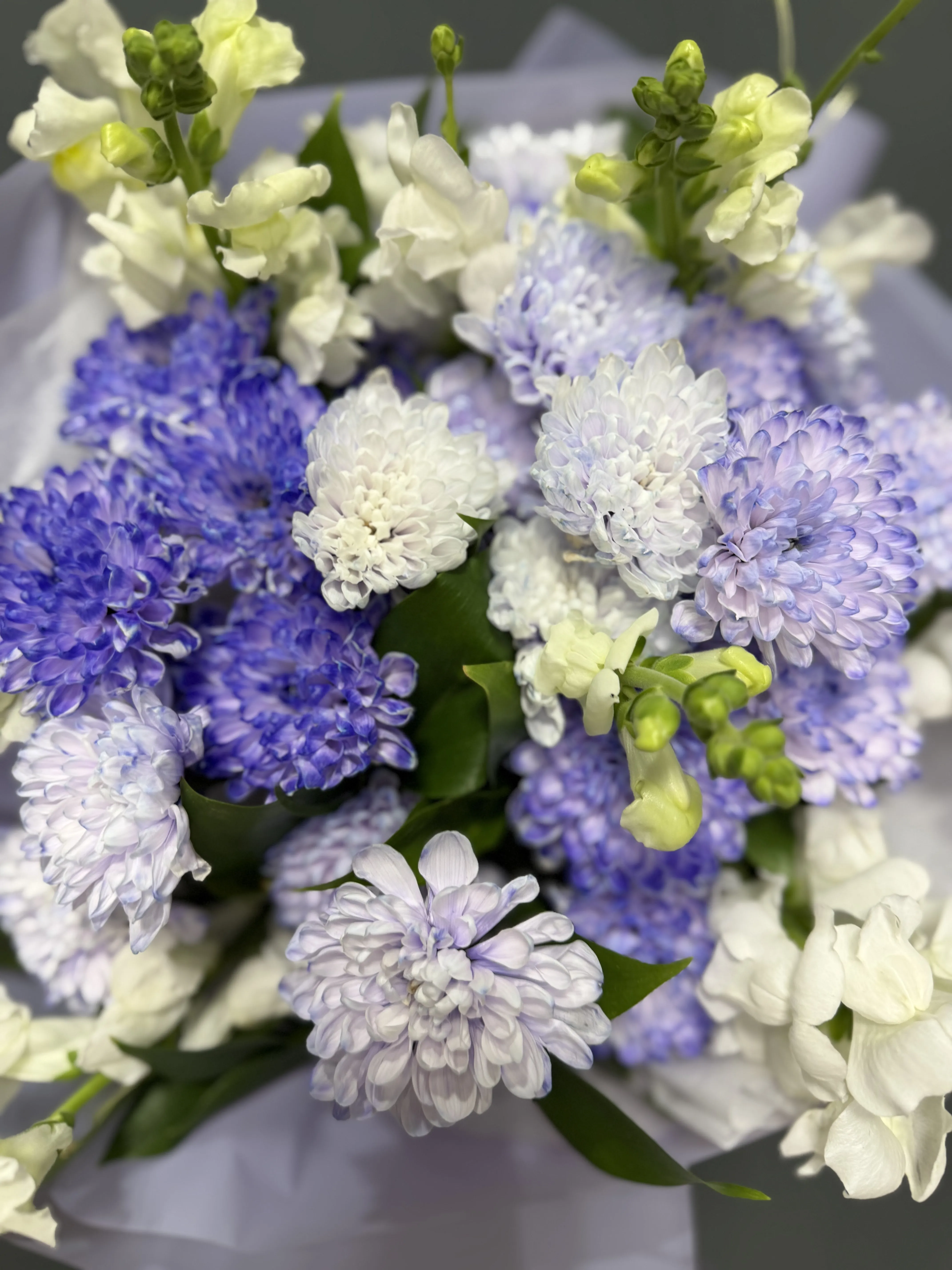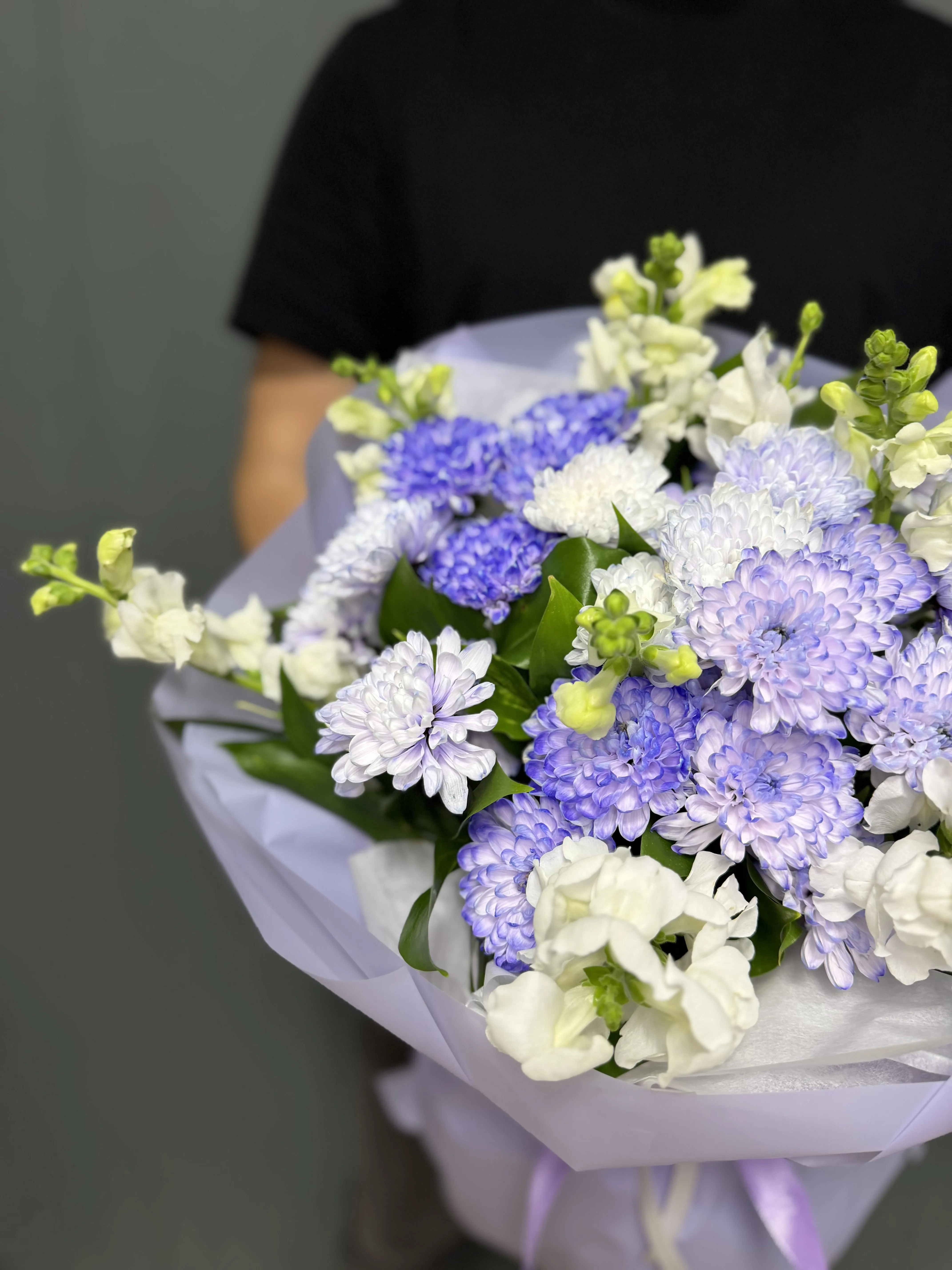 «Фиалковый рассвет» — нежный букет в холодной пастельной гамме, словно первое утреннее небо. Объёмные хризантемы в оттенках сирени и айвори мягко переливаются на фоне свежей зелени, а изящные белоснежные соцветия придают композиции воздушность и утонченность. Такой букет дарит ощущение спокойствия и нового начала, идеально подойдёт для признаний в тёплых чувствах, поздравлений и особенных, трепетных моментов.
