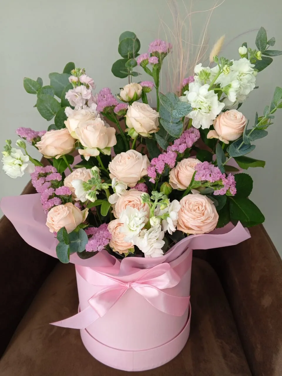 Шляпная коробка с розами, маттиолой и статицей