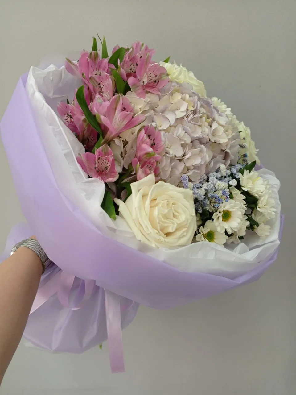Букет из розовой гортензии и кустовых роз