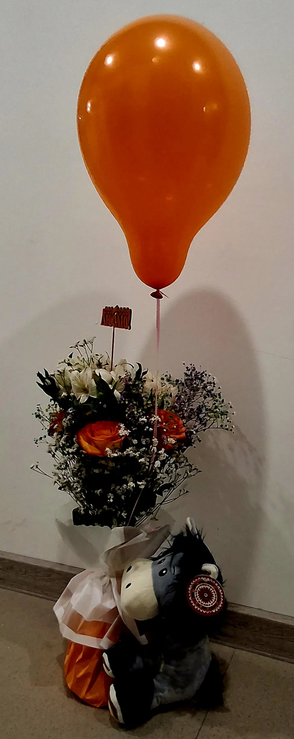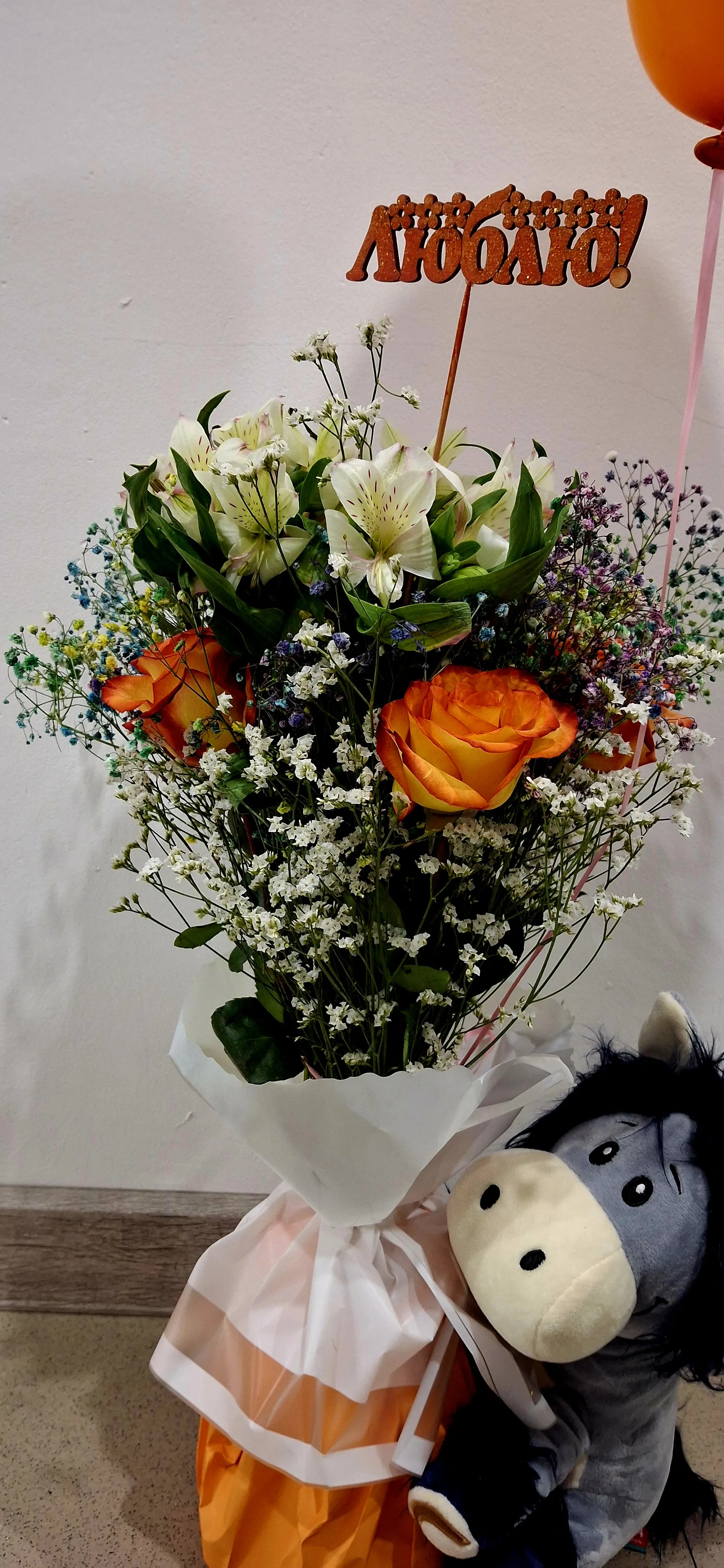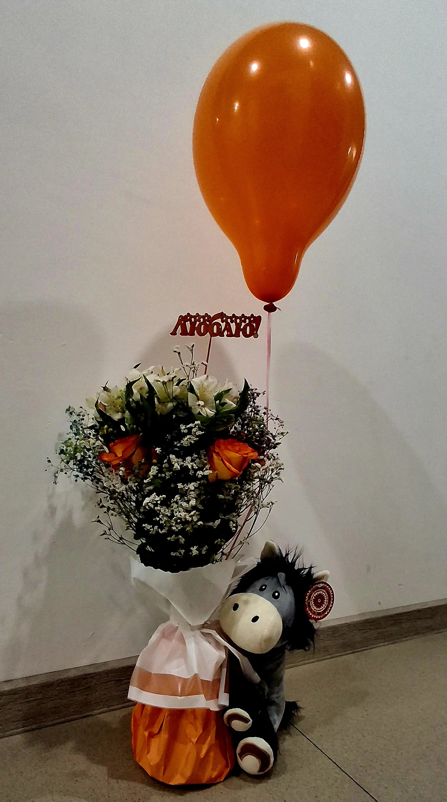 Весёлая композиция из оранжевых роз и альстромерии, собранная на флористическом оазисе. Во главе композиции - милый ослик.