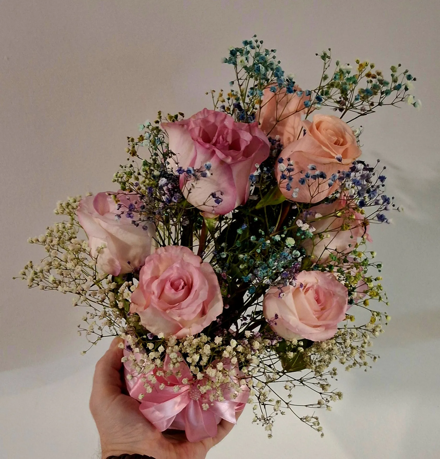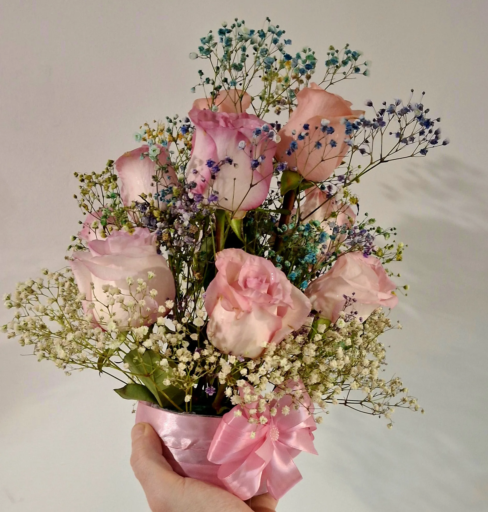 Композиция из 11 розовых роз, собрана на флористическом оазисе. Будет долго радовать Вас.