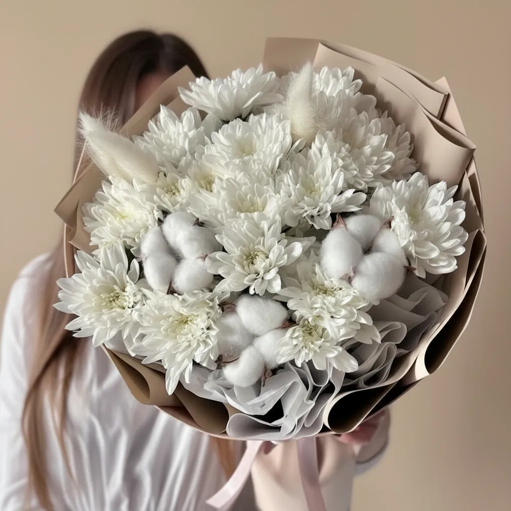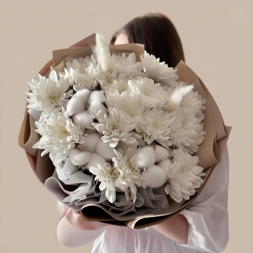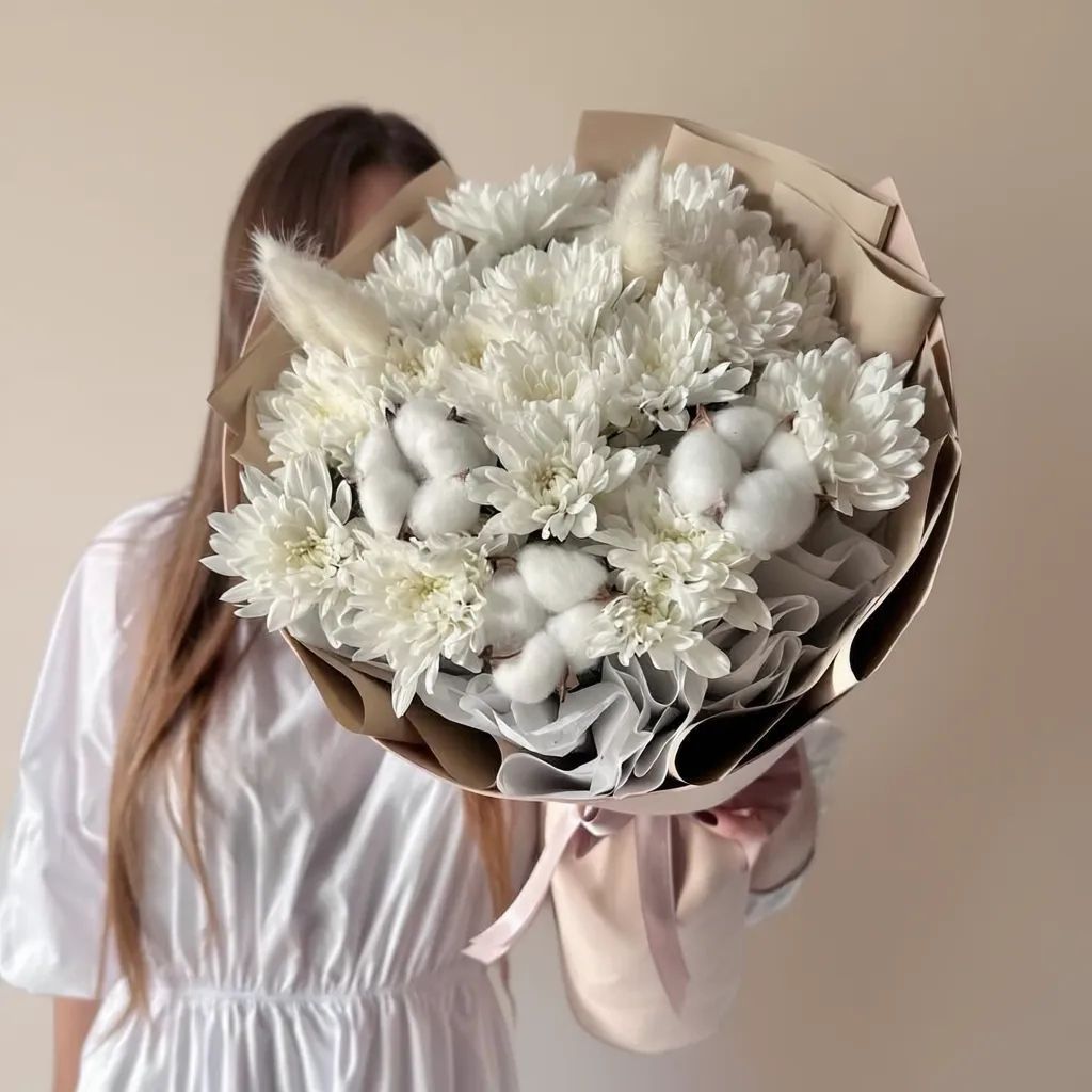 Этот изысканный букет Снежная свежесть очаровывает своей зимней чистотой и нежностью. В его основе — пышные белые хризантемы, символизирующие искренность и чистоту чувств. Они гармонично сочетаются с мягкими пушистыми хлопковыми головками, добавляющими композиции воздушности и легкости. Завершают образ изящные сухоцветы, которые привносят нотку естественности и утонченности. Букет упакован в элегантную коричневую бумагу, что подчеркивает его природную красоту и создает атмосферу уюта. Этот букет станет прекрасным подарком для любого случая, будь то день рождения, юбилей или просто знак внимания. Он подарит ощущение свежести и чистоты, напоминая о зимних снежных пейзажах. Также вы можете подобрать к букету сувенир,коробку конфет или милую мягкую игрушку